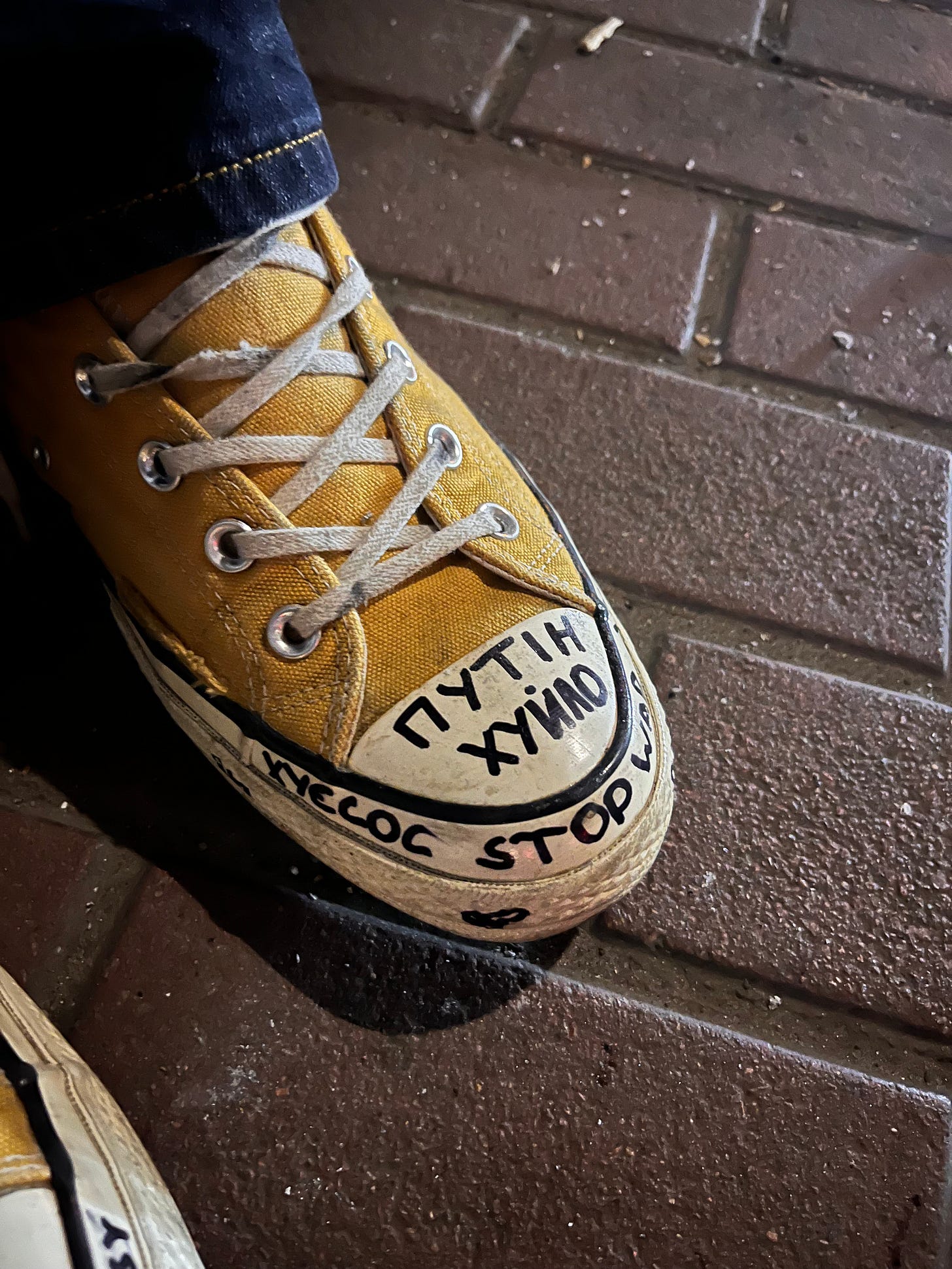 We’d been sitting on a brick windowsill for awhile, talking about Canadian cell phone plan prices (ludicrous) and Ukrainian rock music (amazing), when I noticed what he’d written in Sharpie marker on his yellow Chuck Taylor sneakers.